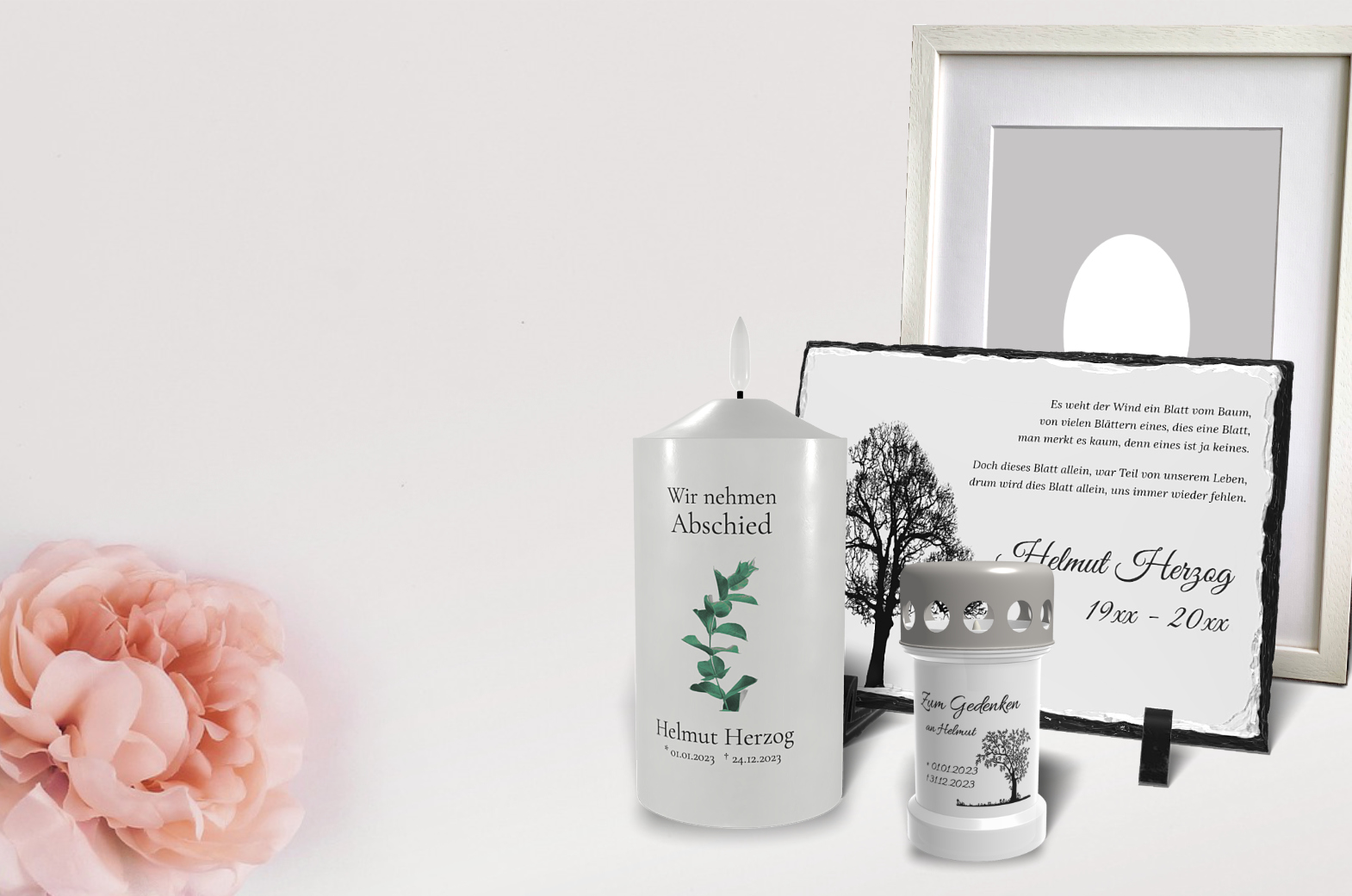Gestalten Sie Trauerprodukte, die besonders persönlich sind. Nutzen Sie jetzt die Möglichkeit in Ruhe & Stille Ihre Trauerprodukte von zu Hause aus auszuwählen und zu bestellen.